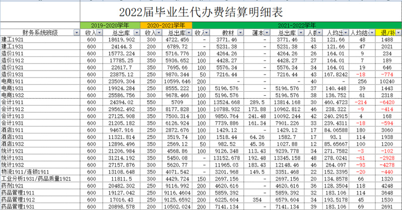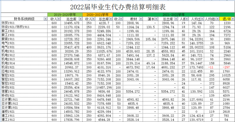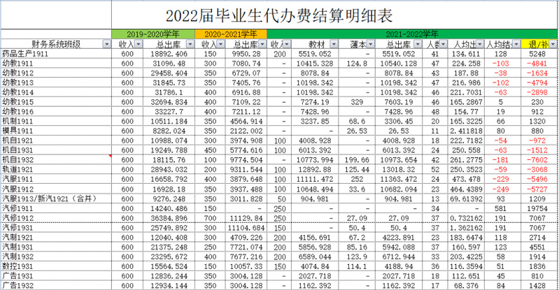 代办费结算采取每年预收,按实结算,毕业时多退少补的方式。代办费结算后的余额,我处将陆续发放至每位同学银行卡中。(如果为负数,则需要补交)